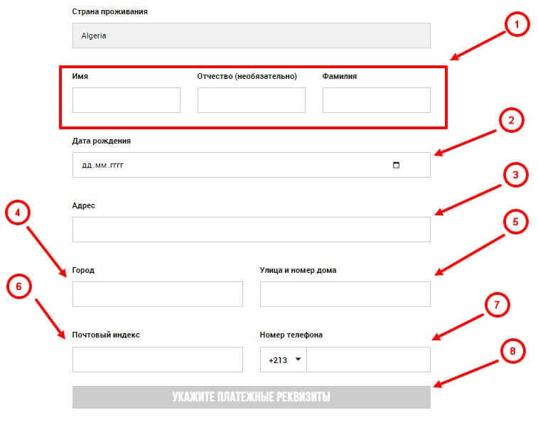 Откроется форма, где нужно указать личные данные инвестора – имя, фамилию, отчество, дата рождения, адрес проживания (город, улица и номер дома, почтовый индекс), а также номер телефона. Затем нажмите на кнопку “Укажите платежные реквизиты”.