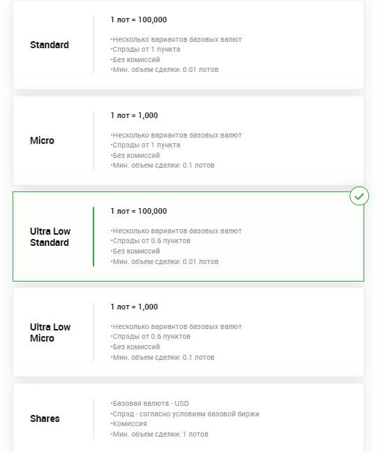 На сайте существует 5 типов счетов (Standart, Micro, Ultra Low Standard, Ultra Low Micro, Shares), которые обладают своими настройками и возможностями. Все они указаны в изображении ниже.
