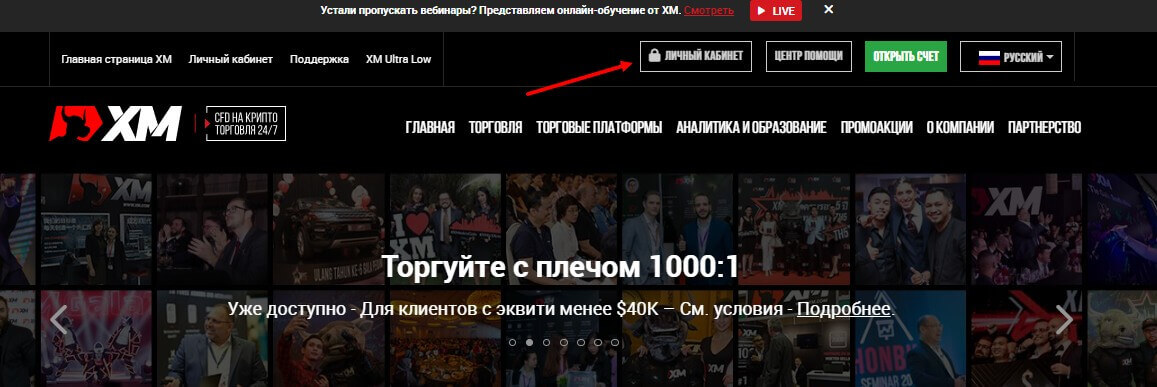 Следующим этапом для того, чтобы начать торговлю – войти в личный аккаунт, используя данные, которые вводили при регистрации. Чтобы сделать это, необходимо перейти на главную страницу сайта и выбрать пункт “Личный кабинет”, расположенный в верхней центральной части сайта.