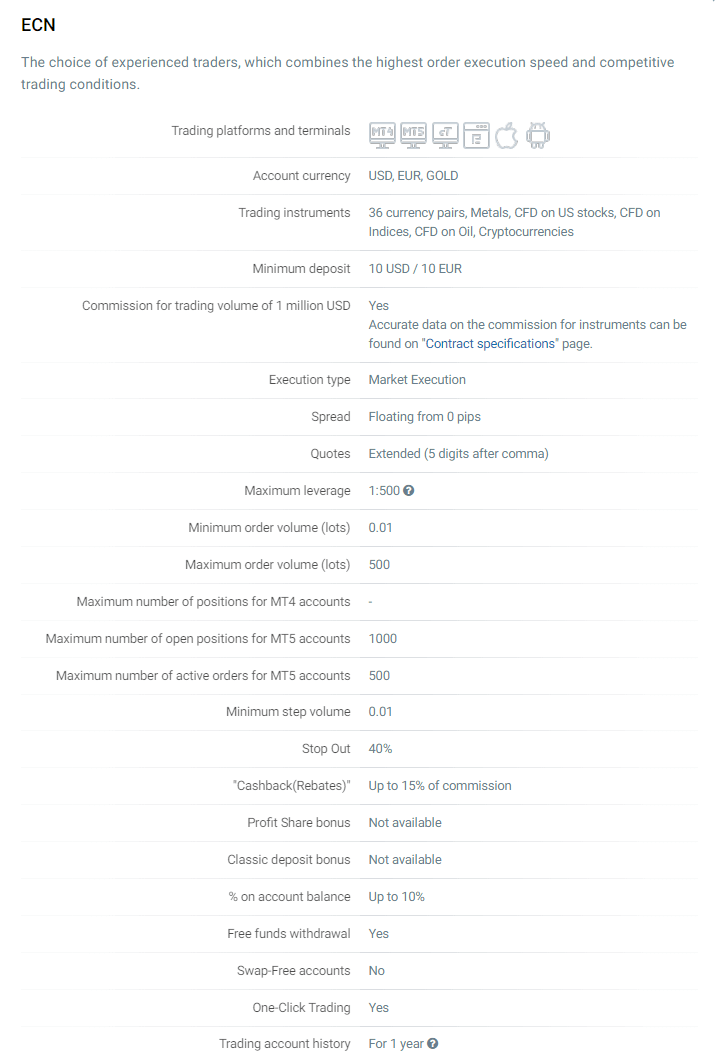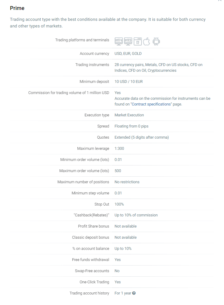 Для начала работы достаточно провести пополнение на 10 американских долларов или евро, вывод ограничен только лимитами используемых платежных систем. Клиенты могут получить кредитное плечо в размере до 1:300. Недоступно получение депозитных бонусов, при этом все остальные программы лояльности работают в полном объеме.