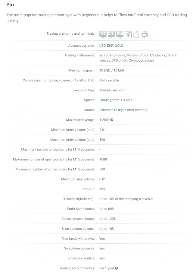Может использоваться со всеми предлагаемыми компанией программными платформами. Достаточная для работы сумма — десять евро/долларов. Спреды плавающие, от 1.3 пипса. С таким предложением на аккаунтах Pro сохраняется доступность реализации большого числа стратегий, в том числе и скальперских. Зарабатывать на внутридневной активности поможет 5-знаковая система котирования с дополнительным числом после запятой, чтобы трейдеры могли зарабатывать даже на малейших движениях курса. Для увеличения объема проводимых операций предлагается кредитное плечо размером до х2000, а также уменьшенный до одной десятой размер минимального лота. Сохраняется доступ ко всем бонусам и однокликовой торговле.