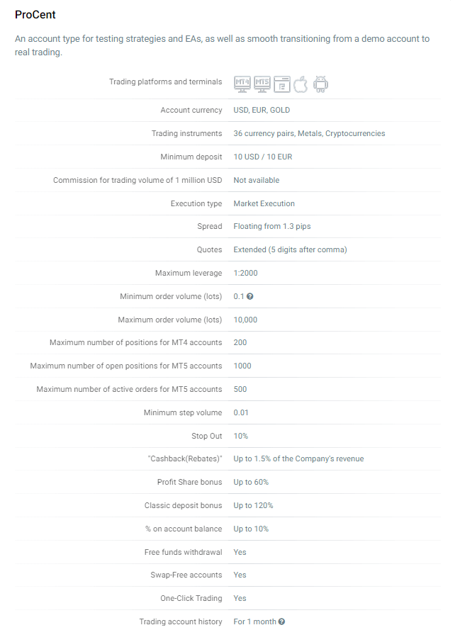 Один из лучших вариантов для тестирования своих способностей или проверки системы заключения сделок «на прочность». Вместо базовых долларовых единиц здесь используются центы, то есть при том же минимальном взносе в 10 долларов или евро можно открывать больше ордеров. С учетом кредитного плеча до х2000 и высокой границей максимального объема средств в одном лоте (10 000 единиц), такие аккаунты действительно становятся лучшим аналогом демо-доступа.