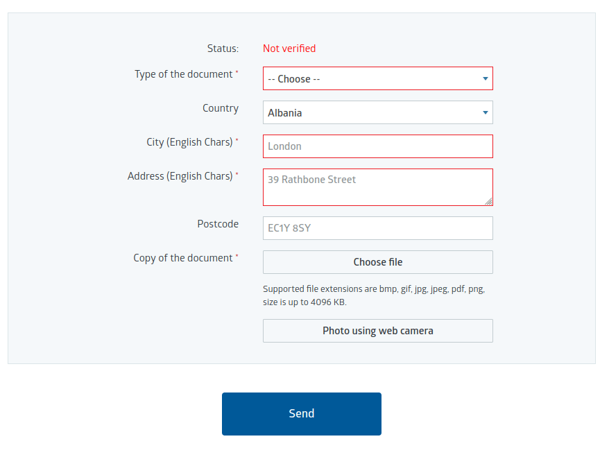 Нажатие кнопки «Send» инициирует отправку введенных данных и приложенных файлов брокеру. Обычно результат сообщается в течение 2-3 рабочих дней, такой срок чаще всего фигурирует в отзывах, как долго проходит верификация.