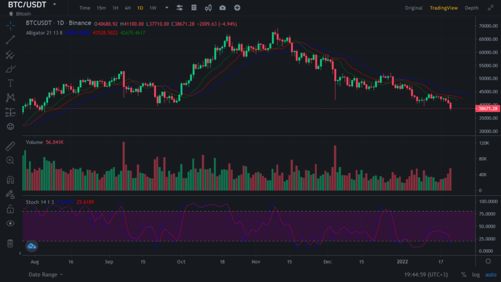 Суть работы рассматриваемого аналитического средства не меняется ни на одном активе. Основное условие – наличие возможности формирования тренда. А уж этого криптовалюте не занимать – с каждым днем все больше трейдеров переходят в данные активы, иногда коренным образом меняя свою специализацию на криптовалютную. Ниже представлен дневной график контракта BTC/USDT.
