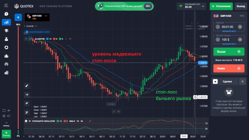 Внимательные биржевые игроки успели сделать для себя важный вывод – инструмент работает только при наличии тренда. Ни о какой работе в канале речи идти не может. Основная его функция – указание на зарождение и развитие тенденции в определенном направлении. Сближение скользящих линий – сигнал на закрытие позиций. Однако на многих трейдерских формах часто указывают на их запаздывание, как отрицательный фактор, и в индикаторе Аллигатор это свойство сохранилось в полной мере. Для предупреждения выхода из сделки на невыгодных условиях рекомендуется использовать дополнительные осцилляторы. Хорошие результаты показывает тандем Stochastic+Alligator. Подробное описание и рекомендации по применению стохастика представлены в статье по ссылке. Не возбраняется применение и других тех.индикаторов, самые перспективные из которых описаны в отдельном разделе нашего сайта.