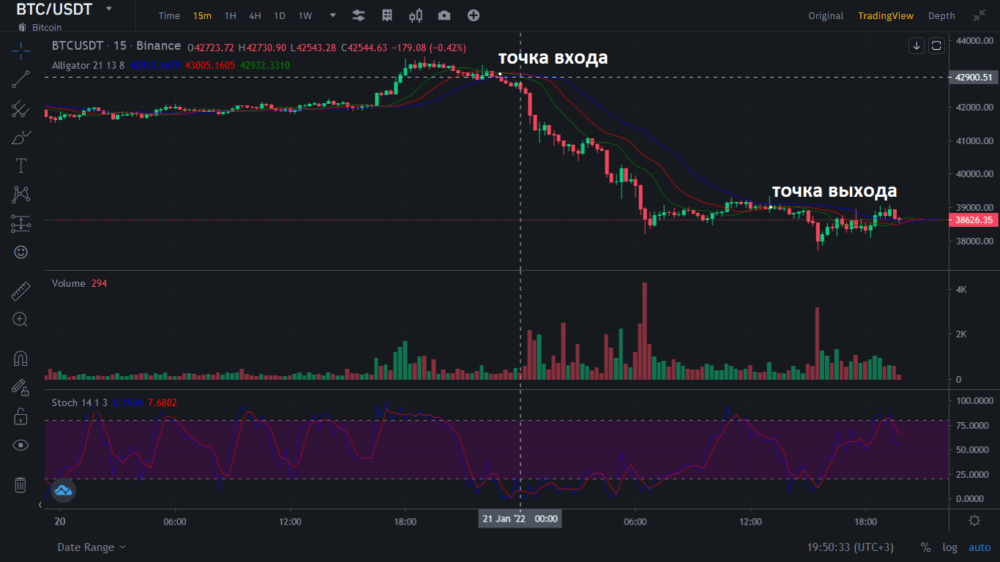 Продолжительные таймфреймы выбраны чисто для удобства визуального отображения, при уменьшении периода графика возможность идентификации тренда с помощью Williams Alligator (в случае с терминалом Tradingview от Binance). Но и при работе на 15-минутном таймфрейме идентификация наилучшего момента для входа не представляет труда.