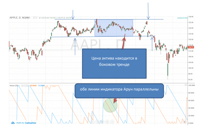 Интересным аспектом использования в торговой системе, где используется индикатор Aroon (особенно в дей — трейдинге) является то, что также можно использовать ее на рынках с определенным ценовым диапазоном. Это особенно характерно для бинарных опционов, для рынка форекс и криптовалют. Например, (как показано на рисунке) когда цена акции компании консолидируется в пределах определенного ценового диапазона («боковик»), линии Aroon.Up и Aroon.Down будут находиться в параллельном положении по отношению друг к другу.