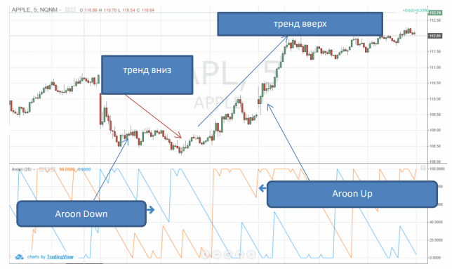 Идея разработки Индикатора Aroon была основана на вычислении и построении двух линий Aroon на графике, который обычно находится вверху или внизу ценового графика. Индикатор Aroon состоит из 2 цветовых линий на графике: 1) Aroon Up и 2) Aroon Down.