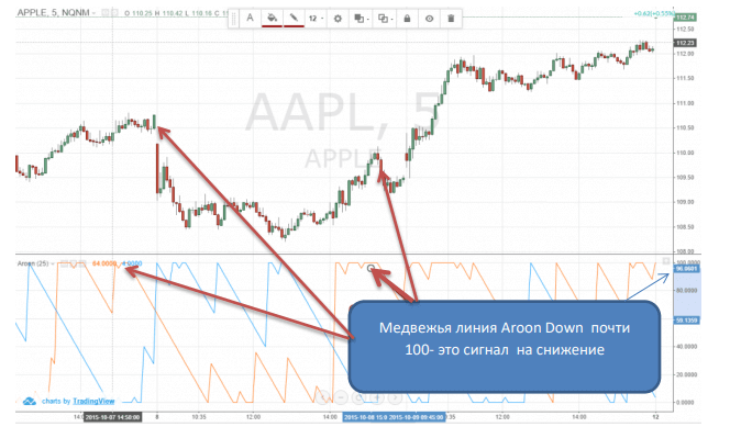 - Когда текущий тренд на рынке имеет тенденция с роста на снижение (или в противоположной ситуации), Aroon.Up или Down будут пересекаться друг с другом.