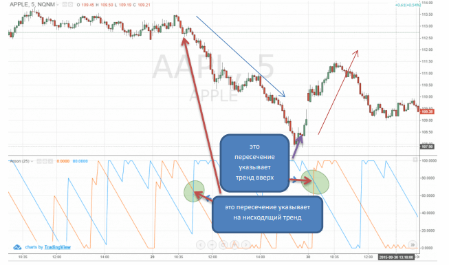 1.Стратегия первая – ситуация когда линии индикатора Aroon пересекают друг друга. Это служит базой для определения характеристики начинающегося тренда.