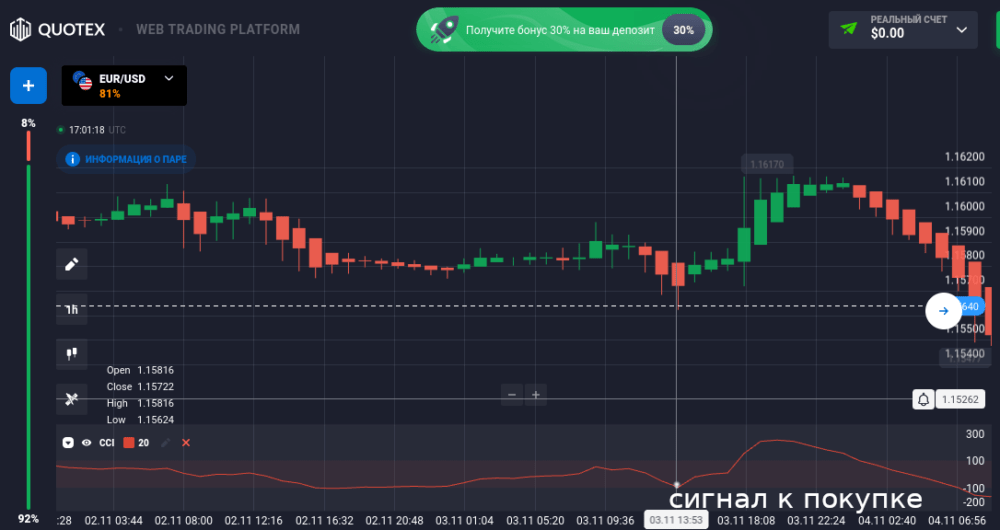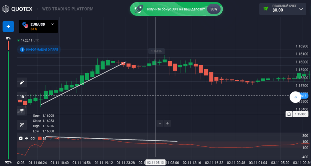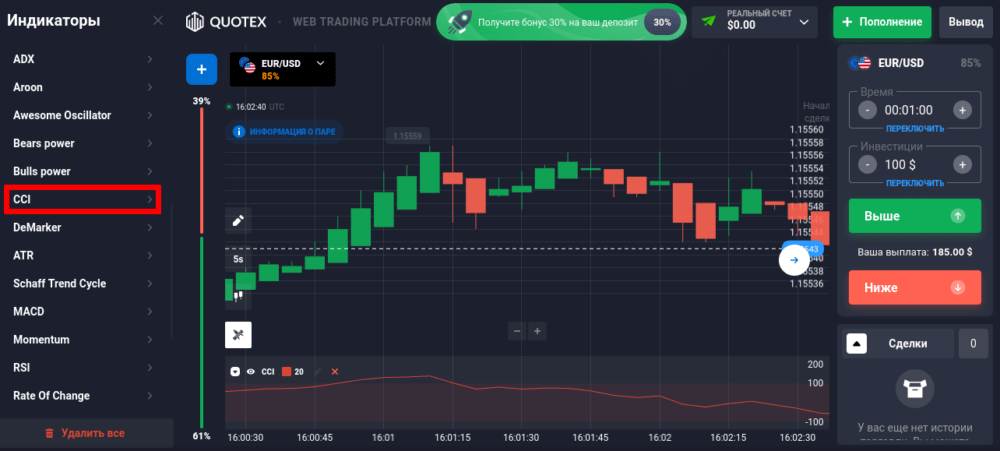 Добавление происходит из меню теханализа и окончательный набор шагов зависит от конкретной реализации применяемого торгового терминала. Далее рассмотрим применение на примере бинарных опционов у брокера Quotex. Выбираем CCI из соответствующего меню.