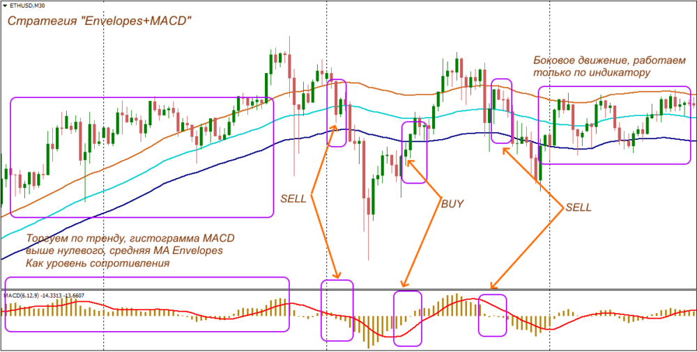Как пользоваться стратегией? Все просто: когда цена выходит за верхнюю границу, есть подтверждение новым максимумом или пробоем нулевого уровня MACD гистограммой снизу вверх открываем покупку (BUY). Для продаж (SELL) противоположные условия: цена под нижней границей Envelopes, гистограмма ниже нулевого после пробоя или формирует новый минимум.