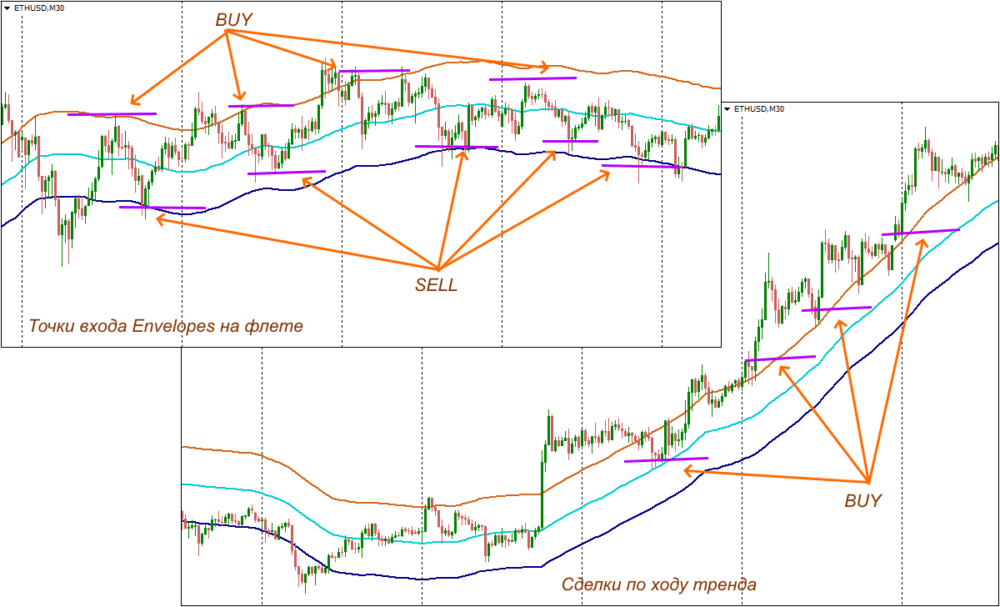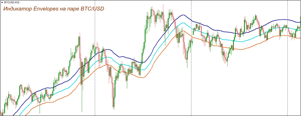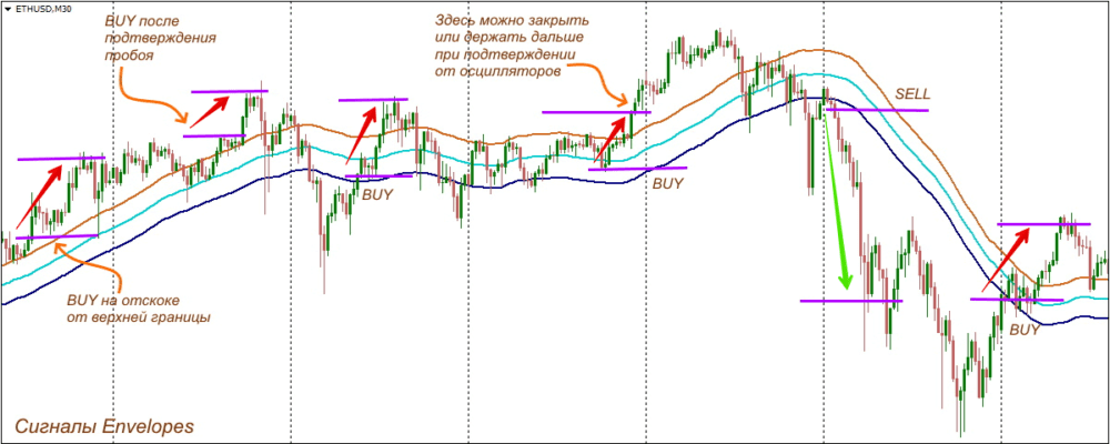 Торговая стратегия для криптовалют может использовать Envelopes как фильтр средне- и долгосрочных Moving Average, также как указатель направления общего тренда. Смотрим примеры: