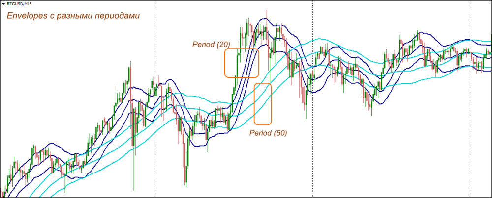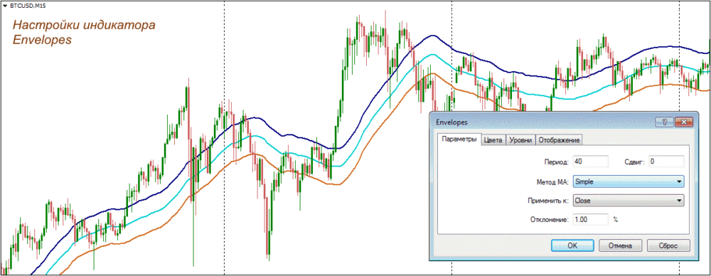Важно: Коэффициент отклонения Envelopes выбираем по средней волатильности актива за последние 3-5 дней, без учета возможных спекуляций и сильных фундаментальных событий. Классическое описание говорит, чтобы 90-95% времени цена находилась внутри канала. Тогда он будет показывать максимум реальных пробоев/возвратов к равновесной цене.