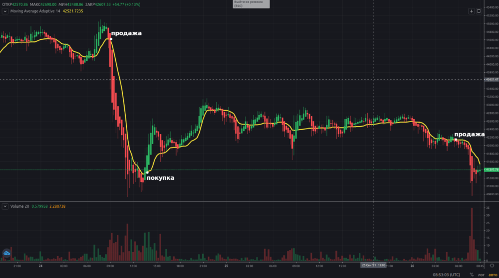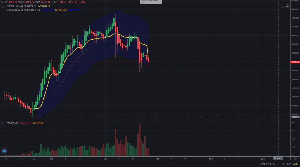 Ниже изображен графит BTC/USDT с дневным таймфреймом и наложенным канальным индикатором. Исходя из текущей ситуации, при надлежащем развитии событий и отсутствии предпосылок к дальнейшему движению цены трейдер может рассчитывать на профит в $14000 на одном ордере.