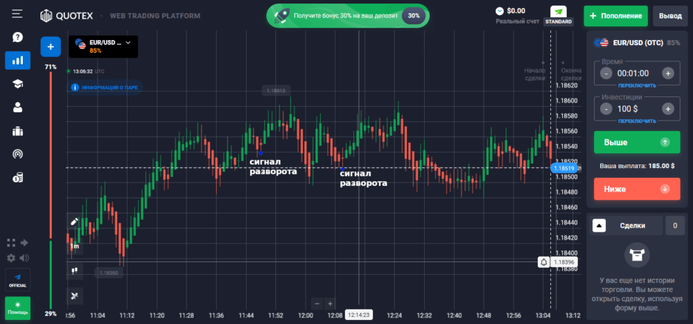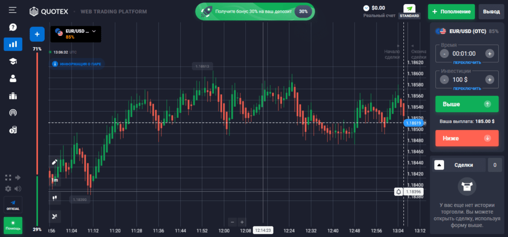 Изначально происходила разработка как часть аналитической системы, однако из-за его высокой информативности и возможности полноценного самостоятельного использования со временем вырос в отдельный способ построения графика финансовых активов. Сегодня его можно найти в списке предлагаемых типов у многих брокеров, достаточно бесплатно скачать специализированную программу для трейдинга или открыть ее веб-версию в браузере. Ниже представлено окно в терминале Quotex. В программах от Metatrader — MT4 и MT5, а также для Quik суть его работы полностью идентична.