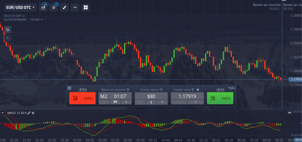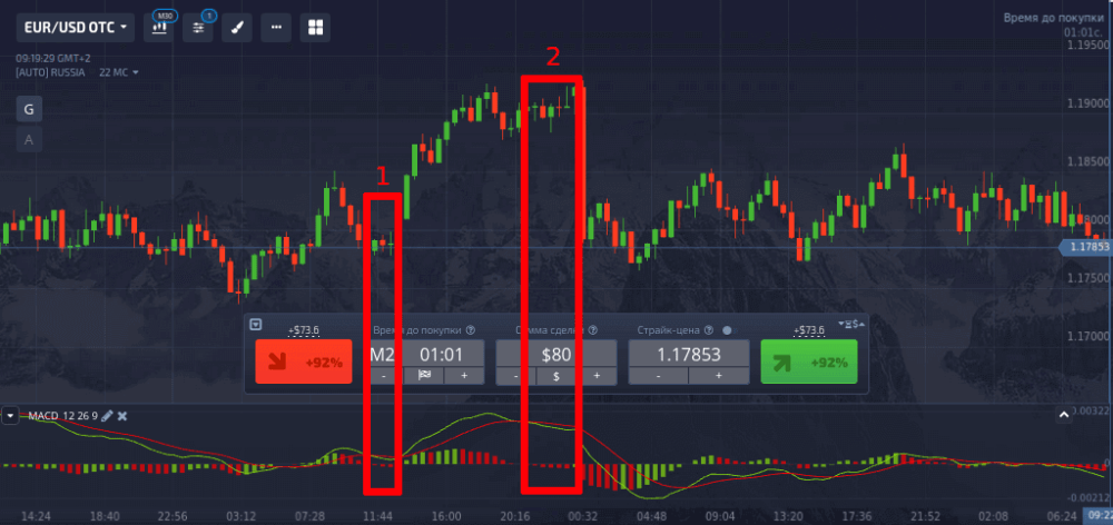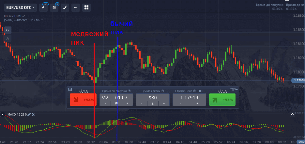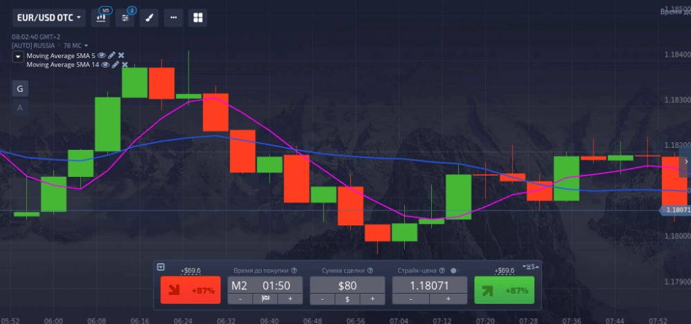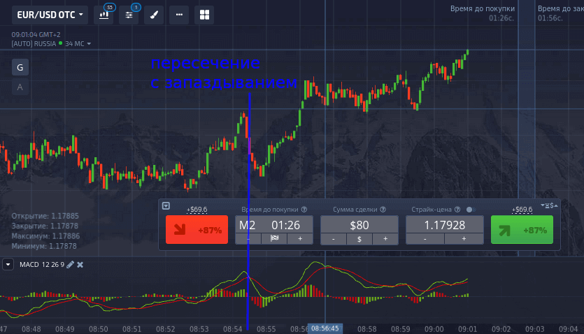 Аббревиатура расшифровывается как Moving Average Convergence/Divergence Trading Method, то есть метод торговли, который основывается на оценке схождения и расхождения скользящих средних. Многие трейдеры знают как использовать способ анализа, при котором на график накладываются две линии, построенные на основе расчета средней цены. Если «короткая» находится ниже параллели с более продолжительным промежутком, считается, что превалируют медведи, и наоборот. Применение такой схемы помогает не только идентифицировать вектор открытия сделки, ни и примерно просчитывать риски. Ниже представлен цифровой опцион на евро-доллар с двумя скользящими с настройкой 5 (фиолетовая) и 14 (синяя) (наиболее используемая комбинация).