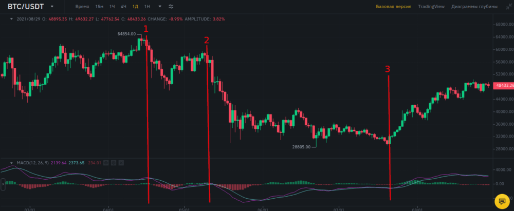 Использовать дивергенцию и конвергенцию можно на любой площадке. Если ранее рассматривались только бинары, то при детальном анализе графика криптовалюты биткоин, торгуемой на бирже Binance, можно встретить похожий набор сигналов. При переходе к снижению проявилось небольшое запаздывание на дневном графике (моменты 1 и 2), в то время как на развороте в сторону росту (точка 3) был идентифицирован практически идеально.