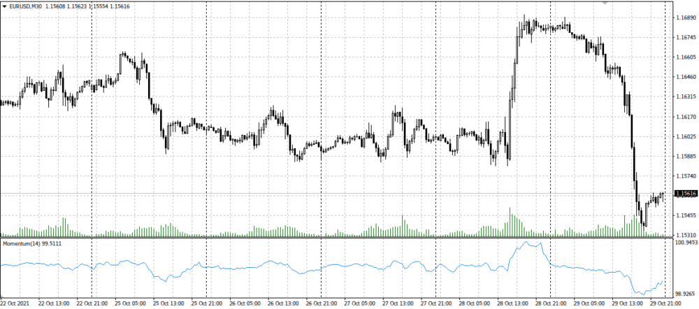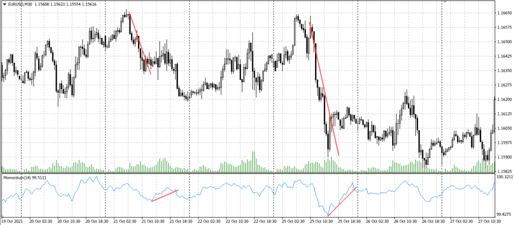 Ниже показан пример графика евро/доллара с наложенным Моментум для получасового таймфрейма.