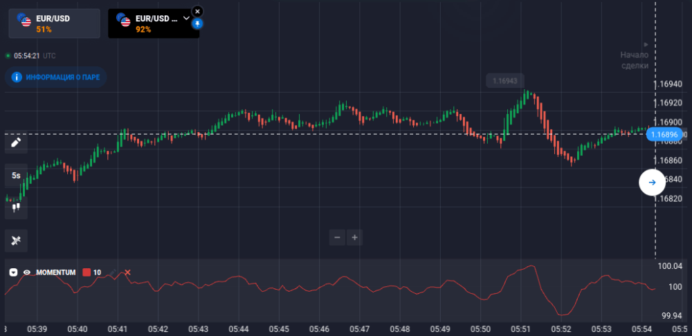Еще одним неоспоримым преимуществом является возможность применения на графике любого актива с любым таймфреймом. Ниже показан пример для рассмотренной ранее валютной пары евродоллар, но в бинарных опционах. Даже на графике длительностью в 5 секунд для каждой свечи линии Momentum дают трейдеру четкий вектор направления открытия позиций.