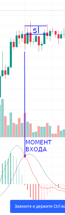 Когда наблюдается медвежье расхождение, цены последовательно растут, а пики осциллятора схожими темпами движутся вниз. В окне индикатора происходит пересечение линий, в итоге «быстрая» уходит вниз, а на перекрестии формируется точка красного цвета, информируя биржевого игрока о возникновении возможности для продажи. В данном случае в качестве защитной границы можно использовать уровни максимума или открытия (если речь о понижающемся баре) тела свечи (отмечен синим каналом SL на изображении).