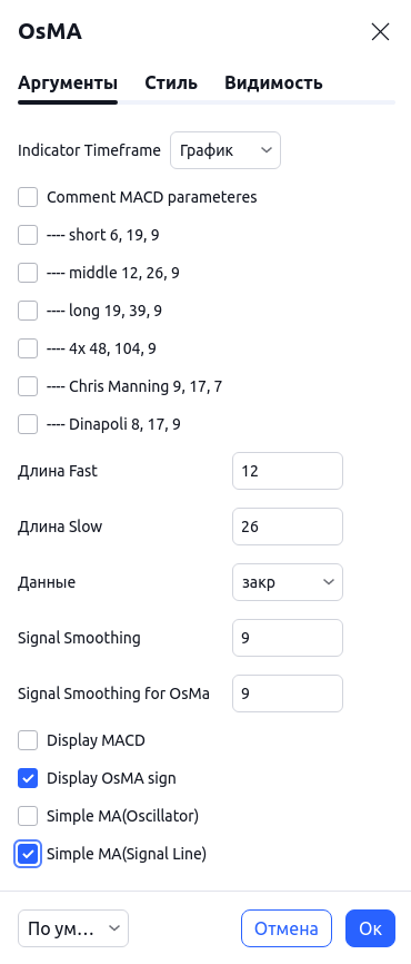 - Параметры сглаживания — отвечают за то, насколько пологими или острыми будут пики графика. Значение 1 — горизонтальная линия, соответствующая текущему значению осциллятора без дополнительных элементов.