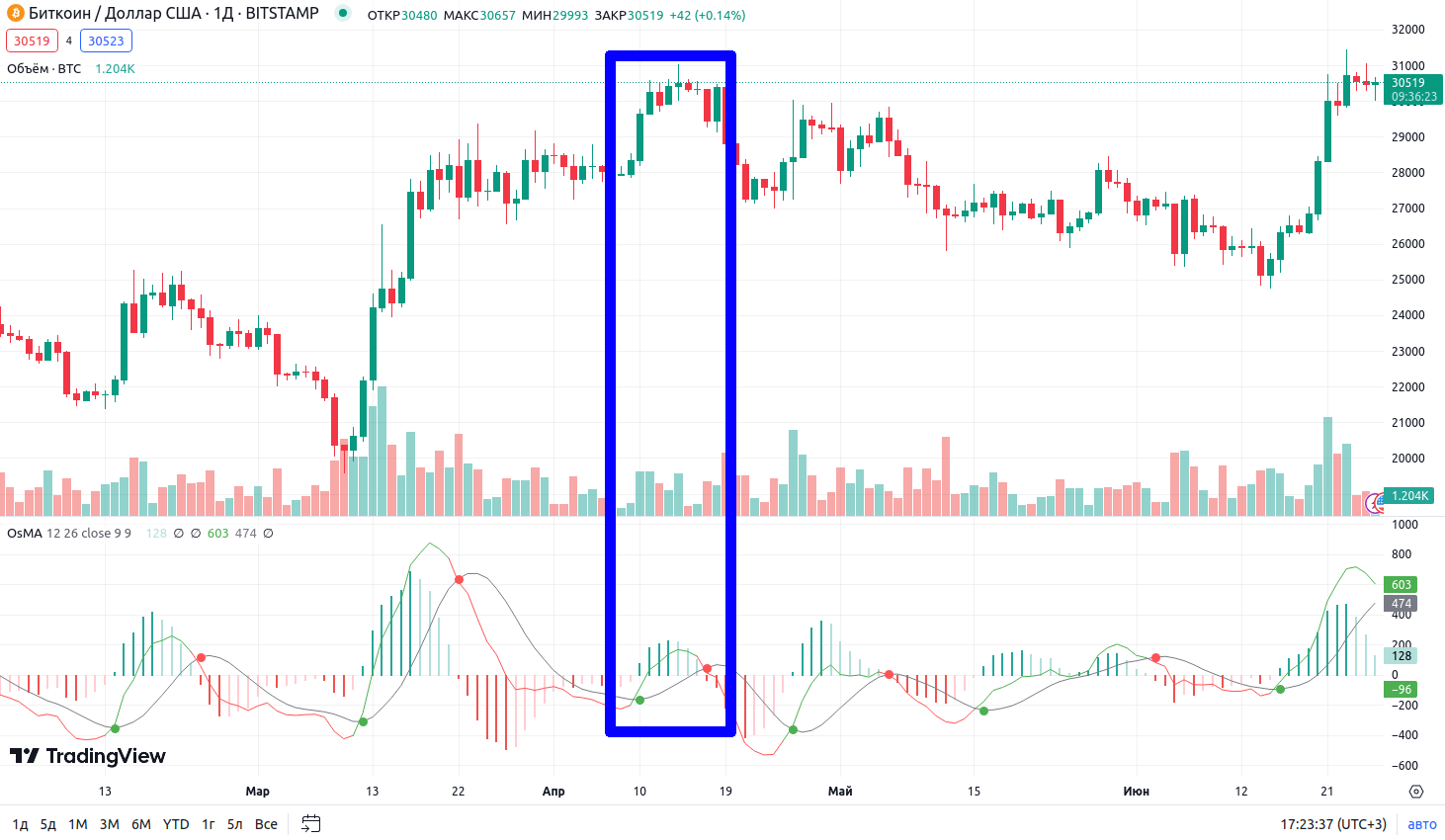 Еще один способ идентификации сигнала OsMA — пересечение гистограммой нулевого уровня. Для этого из рабочей области можно скрывать сигнальные линии, получая следующую картину.