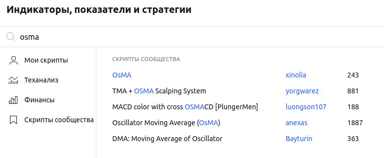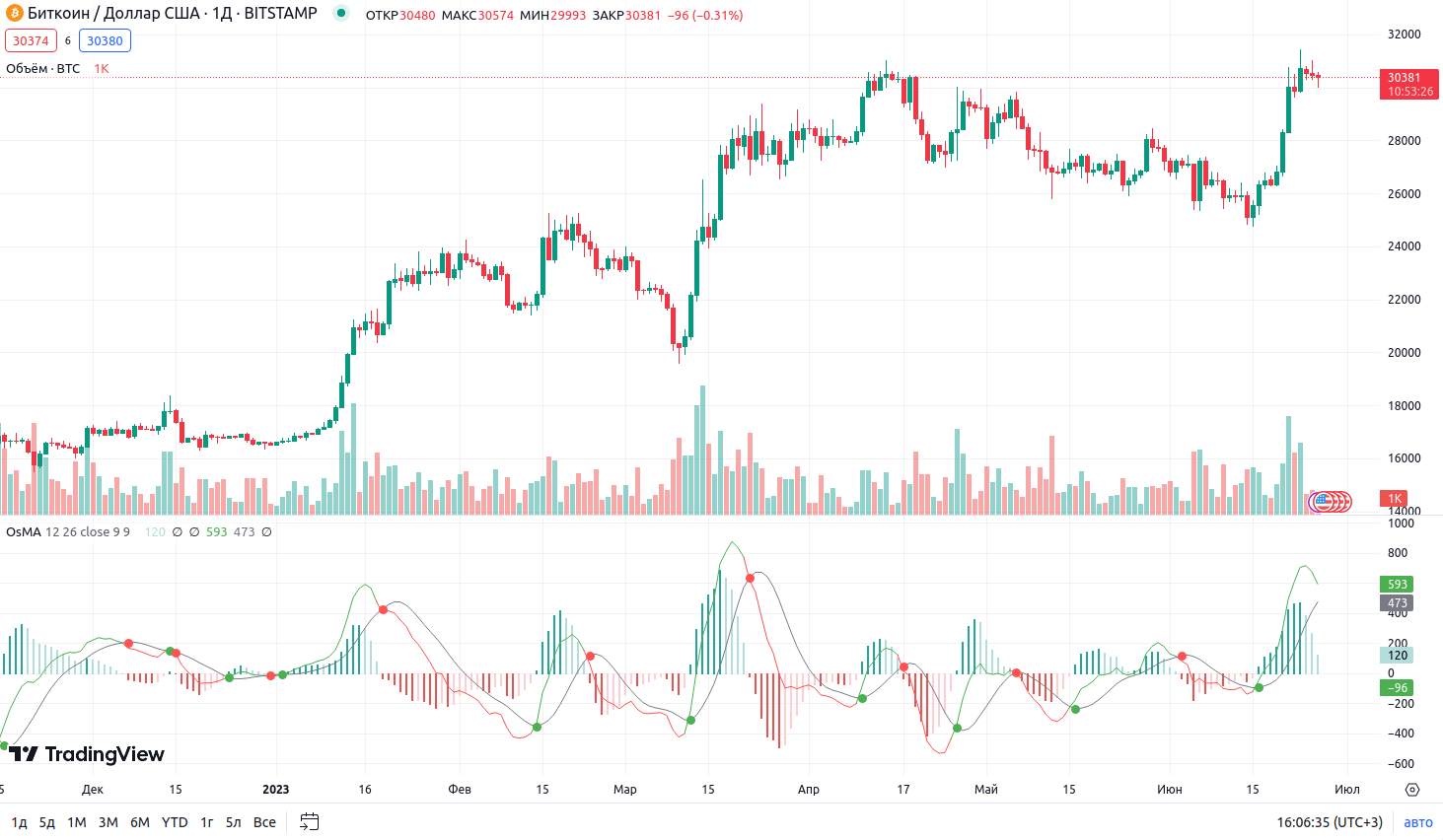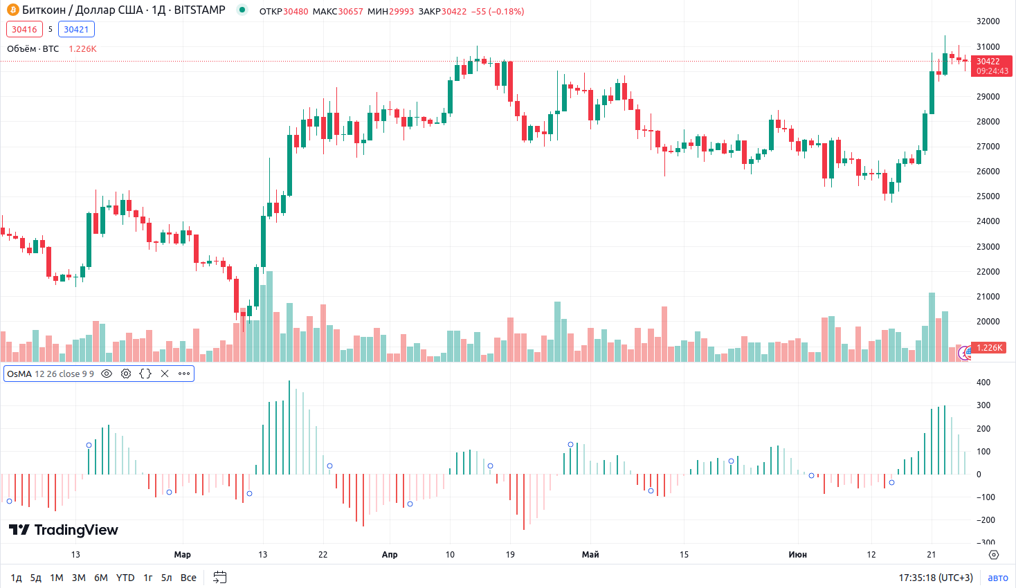 Сразу отметим, что индикатор OsMA — нетипичный инструмент технического анализа, как торговать с его помощью прибыльно, увидим далее, для начала дадим читателям совет предварительно установить стороннюю библиотеку с этим средством в терминалы для MT4 или для MT5, последней версии самой популярной биржевой платформы, нацеленной на повышение уровня алгоритмизации рабочего места биржевика. В библиотеке MQL и на финансовых форумах для этих программ можно найти сразу несколько различных модификаций, и вопрос выбора может для новичков стать настоящей проблемой. В таких случаях рекомендуем установить инструмент со стандартными настройками и проследить его корреляцию с трендом — чем меньше отклик индикатора на смену настроений рынка, тем лучше. Ниже представлены различные его виды в терминале Tradingview для дневного графика криптопары BTC/USDT.