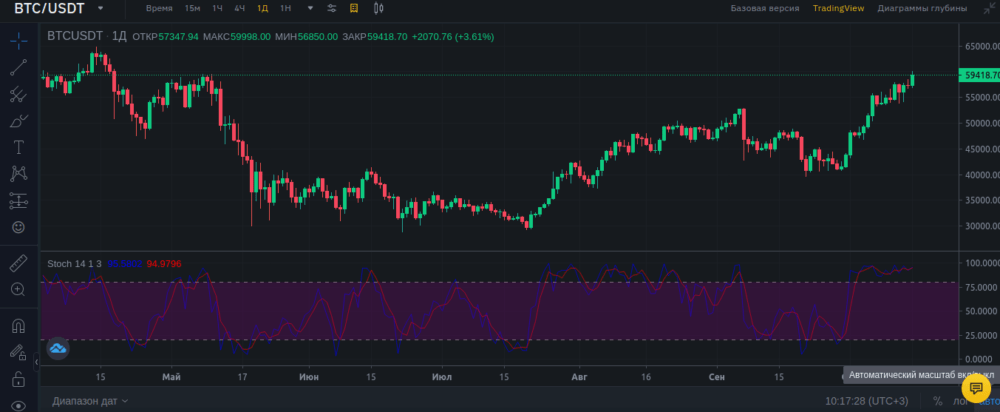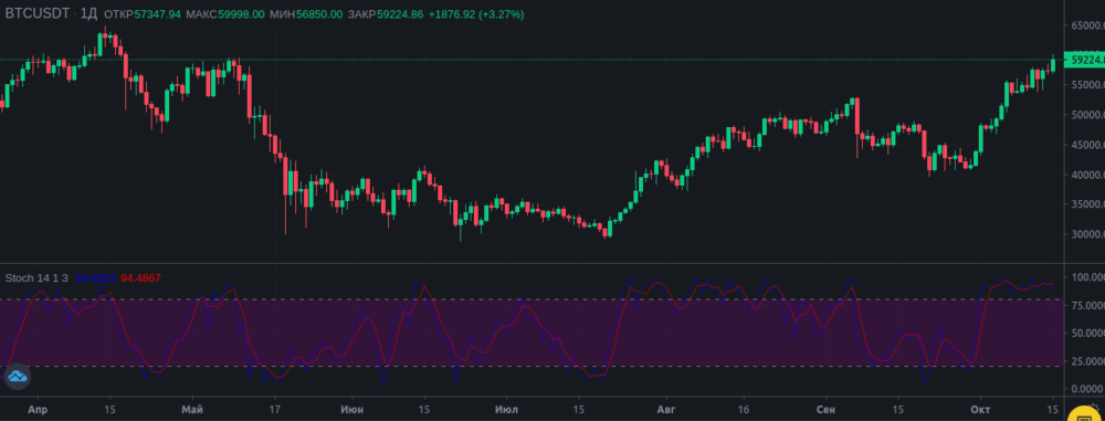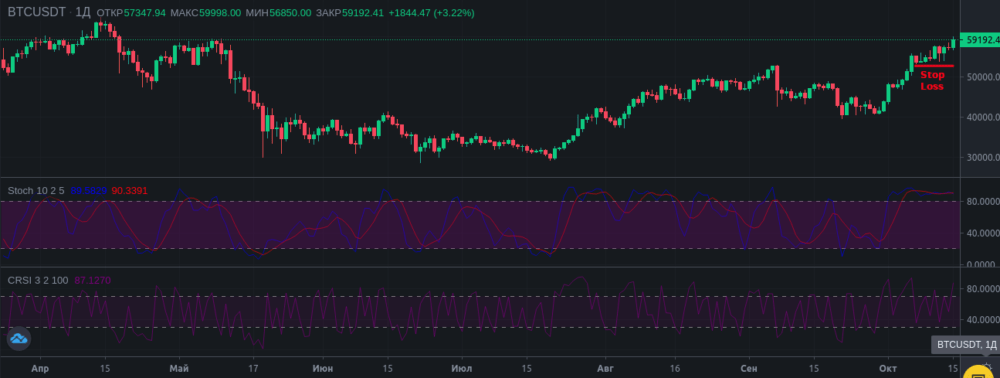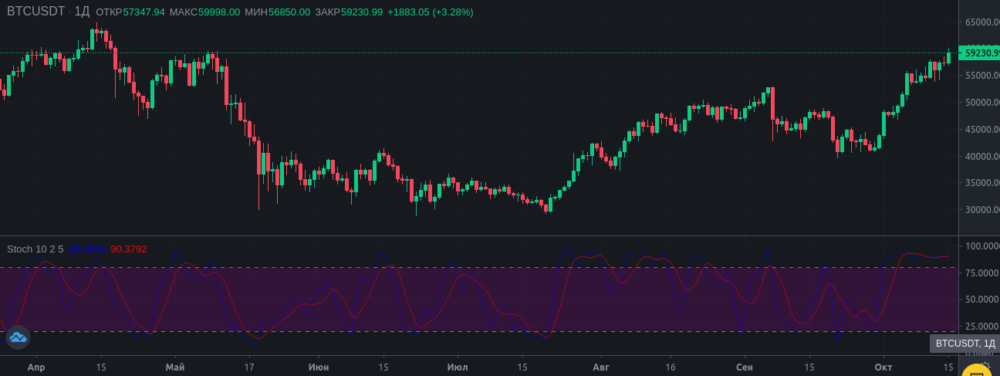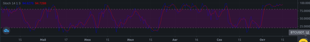 На реальном примере BTC/USDT ниже имеем высокую вероятность продолжения роста — обе линии стохастика находятся в зоне перекупленности, сигналов к прекращению тенденции нет.