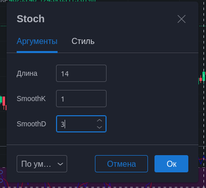Настройки параметров на отображаемом графике в Binance производятся в соответствующем окне. Доступно три основополагающих вводных — используемый период и аргументы для %K и %D.