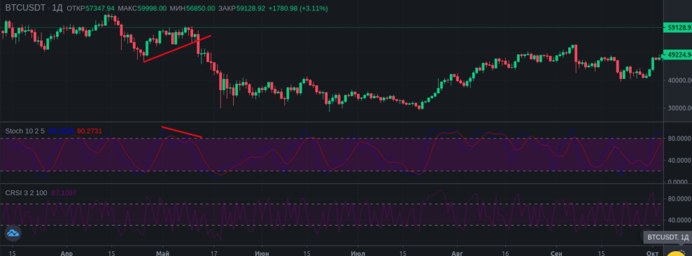 Еще один сильный сигнал, который может возникать — расхождение между линиями, построенными по экстремальным значениям основного графика и индикаторного. Потому инструмент иногда называют индикатором дивергенций, если линии расходятся и конвергенцией при их схождении. В данной ситуации необходимо отталкиваться от предположения, что выдаваемые стохастиком алерты (при необходимости можно настроить и звуковые оповещения) имеют более высокую достоверность и следует использовать их в работе. При идентификации подобных состояний у стохастика используют линии, прочерчиваемые по точкам %K. Ниже графически показана подобная ситуация.
