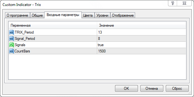 Самое важное перед работой – правильная настройка кастомного индикатора TRIX для торговли. Каждый сможет указать нужные для себя значения, которые вы сможете увидеть на скрине ниже, в качестве примера его настройки.