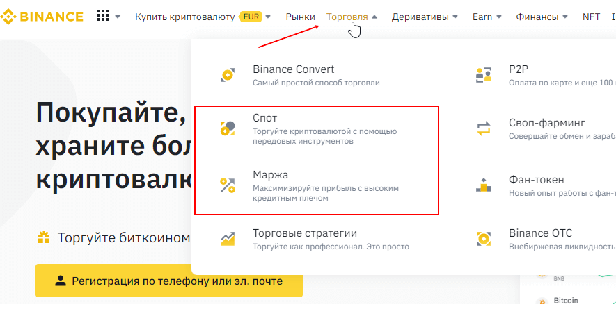 - Навести курсором мыши на “Торговля” и далее выбираете необходимый вид торговли. Работает как при маржинальной, так и спотовой торговли, в том числе при продаже/покупке криптовалют и для бинарных опционов.