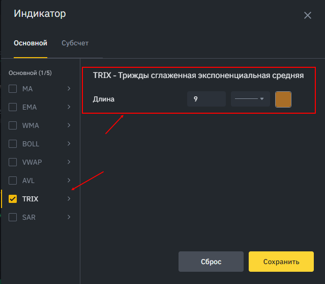 - Как только выбрали нужный индикатор, вам откроется настройка трижды сглаженной экспоненциальной средней, где нужно указать её длину. А по умолчанию на бирже Бинанс стоит цифра 9.
