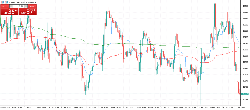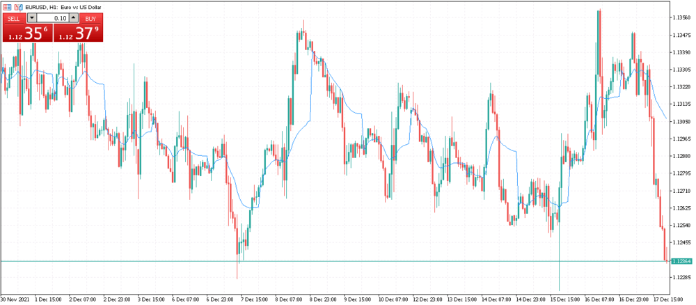 VWAP лишен многих недостатков своих прародителей. Его формула состоит из произведения суммы объемов и цены за указанный период, деленное на сумму объемов. Таким образом, котировки получают соответствующий вес, зависящий от проторгованных сделок. На основании полученных данных выстраиваются линии индикатора. Ниже приведен пример его отображения на часовом графике валютной пары евро-доллар на Форекс.