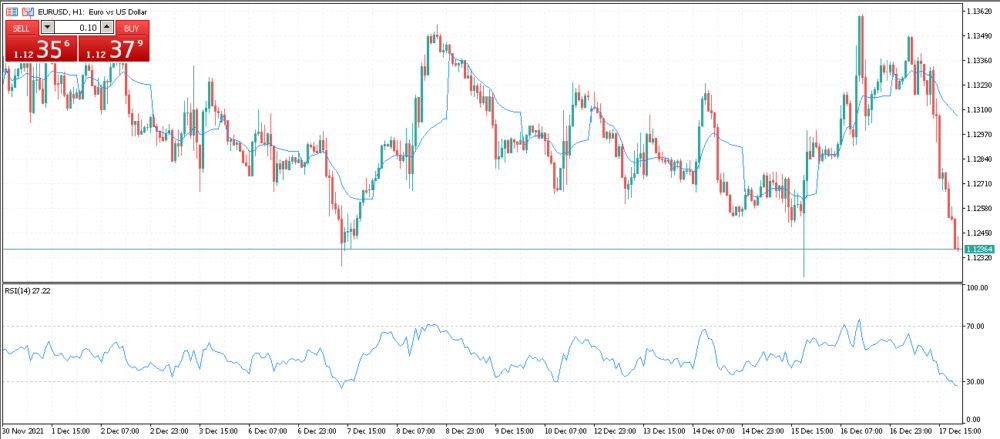 Идентифицировав направление тенденции, биржевой игрок принимает решение об актуальности входа в рынок. В этом ему могут помочь индикаторы состояния рынка — показателей классического RSI достаточно, чтобы понимать, остается ли возможность получения прибыли. Еще больше мощных аналитических средств можно найти в отдельном разделе по ссылке. На графике далее видим, что тренд находится в состоянии, близком к минимальному порогу перекупленности 20. Это не дает большой перспективы заработка, однако зная нюансы работы RSI, можно открыть позицию, установив уровень ограничения убытков на максимуме текущего бара, для более консервативных вариантов допускается использование цели на максимуме предыдущего бара.