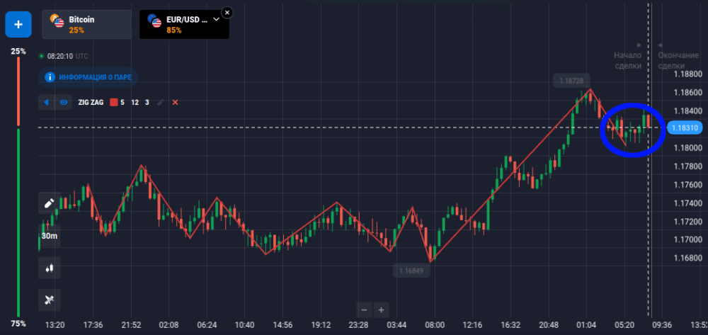 Из величины глубины в реальном времени рассчитываются актуальные максимум и минимум. Ширина образованного коридора принимается за 100%, и если в дальнейшем тренд изменяет свое направление от последнего максимума на величину отклонения, система считает, что был сформирован очередной максимум/минимум и если в дальнейшем в обратном экстремуму направлении формируются свечи в количестве, заданном в величине «Назад», отрисовывается формация вершины или дна. Именно по этой причине ниже видим только понижающуюся прямую — последние свечи до закрытия сессии не продемонстрировали достаточного роста, а значит условие формирования пика не выполнено.