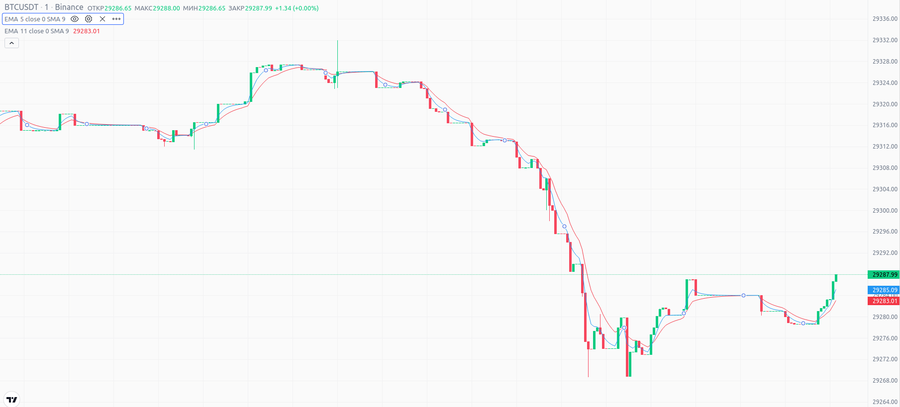 Ниже для примера на минутном графике показана комбинация двух экспоненциальных скользящих средних с периодами 5 и 11, которые при взаимном пересечении между собой дают четкие сигналы ко входу в рынок.