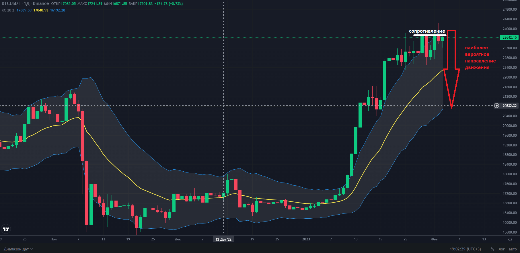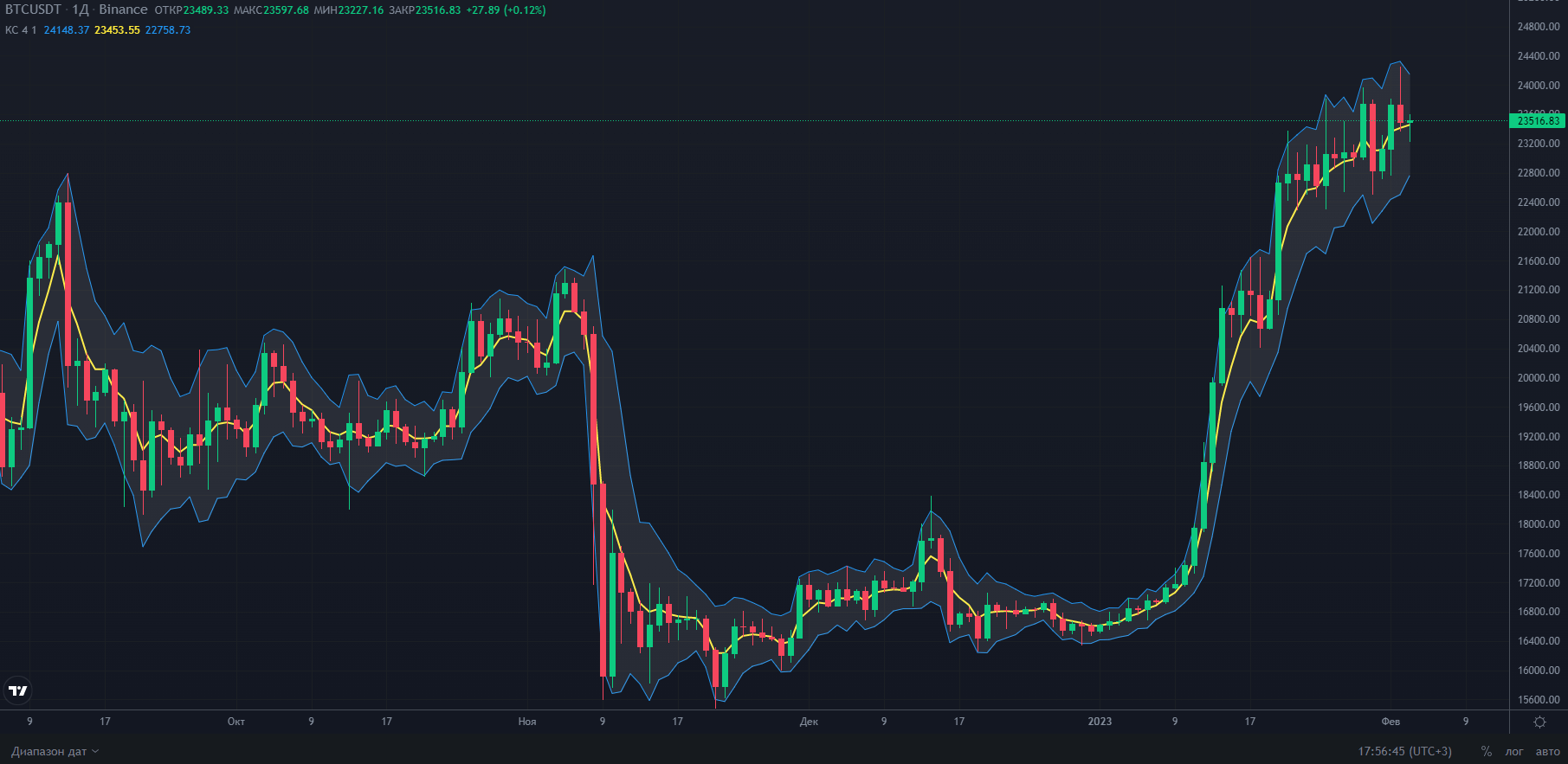 Далее рассмотрим часовой график криптопары BTC/USDT с озвученными выше настройками – длиной 20 и множителем 2. При изменении таймфрейма необходима перенастройка параметров. Ограничений по длительности графика нет, пользоваться инструментом можно одинаково эффективно как на недельном промежутке, так и на коротких интервалах, как на 3 минуты и меньше.