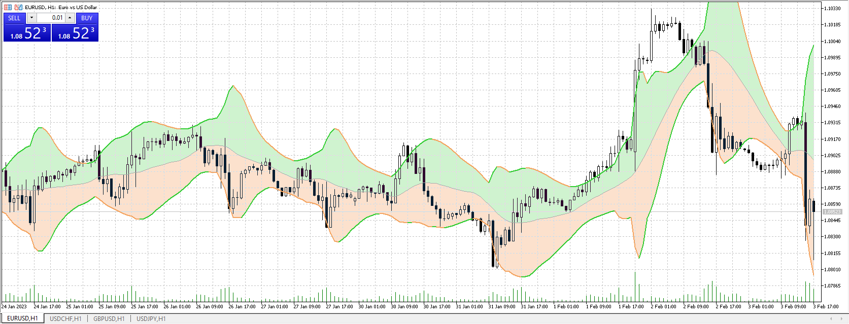 Выше приводится окно терминала у брокера Binance, где в составе модификации рабочего места от Tradingview включен рассматриваемый инструмент. Для MT4 или для MT5, самых популярных торговых программ от Metatrader, бесплатно скачать и установить одну из предлагаемых модификаций не составит труда. Основное отличие их принципов работы – в правилах отрисовки средней линии (в некоторых версиях помимо роли локальной границы прямые часто показываются с настраиваемыми параметрами цветового обозначения, сигнализирующего о смене тренда внутри рассматриваемого интервала). Для примера один из представленных в стандартной библиотеке техиндикаторов показан в Metatrader 5 для валютной пары евро-доллар на часовом таймфрейме.