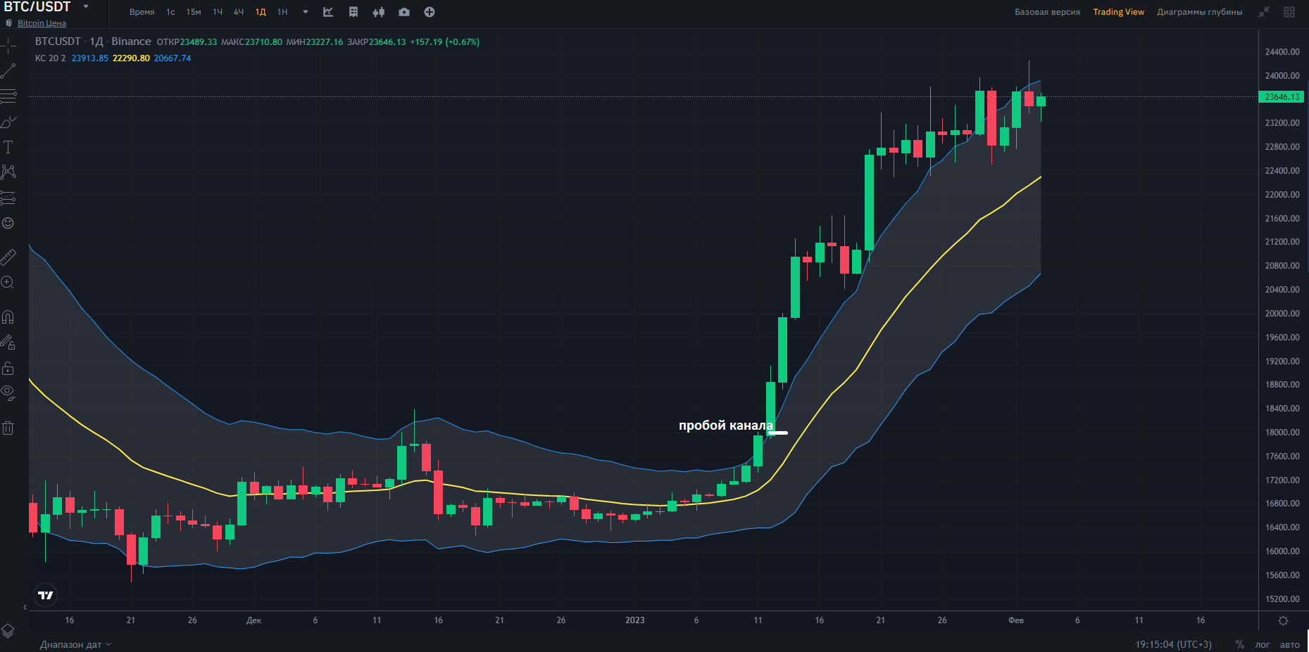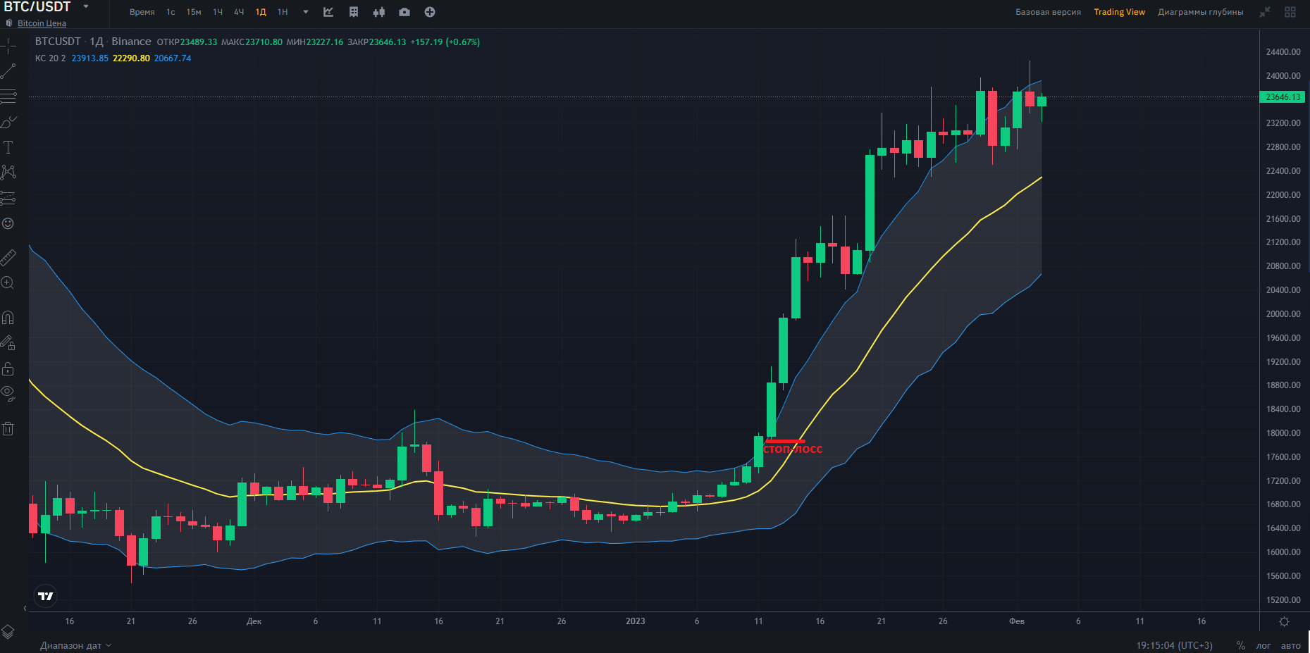 На примере графика криптовалютной пары BTCUSDT имеем корреляцию около верхней границы с легко идентифицируемым уровнем сопротивления (белая линия) около уровня в 23741$. Устанавливая ордер ограничения убытков на этом значении, имеем потенциальный профит (разность между верхней и нижней границами) в 3216$.