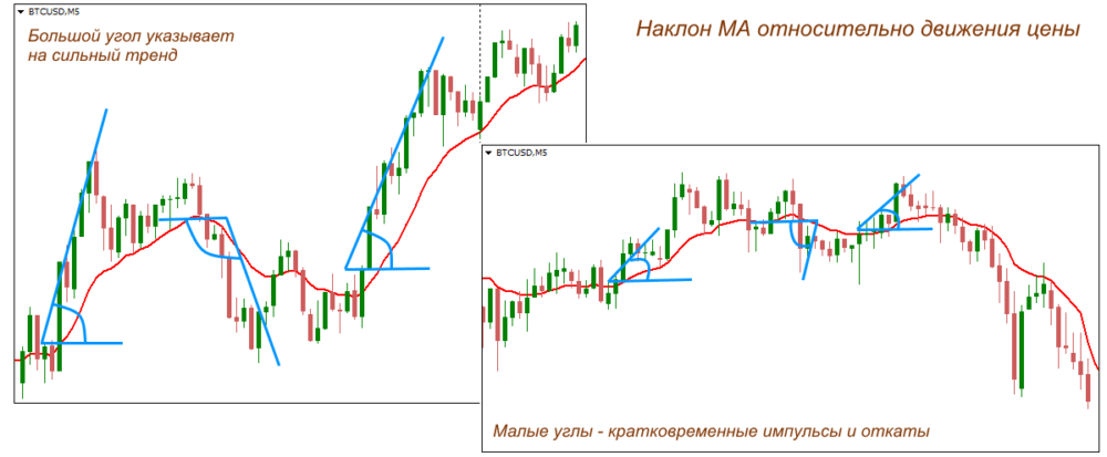 По сути, направление скользящей средней и положение цены относительно нее, не что иное как текущий баланс сил покупатели/продавцы: идет вверх, значит рынок за «быками», вниз перевес «медведей», горизонтальное движение означает равенство сил перед новым трендом. Но, как стратегия определит силу новой или текущей рыночной тенденции – может это импульс с возвратом во флет, или краткая коррекция? Это можно сделать по углу наклона, как показано на рисунке: