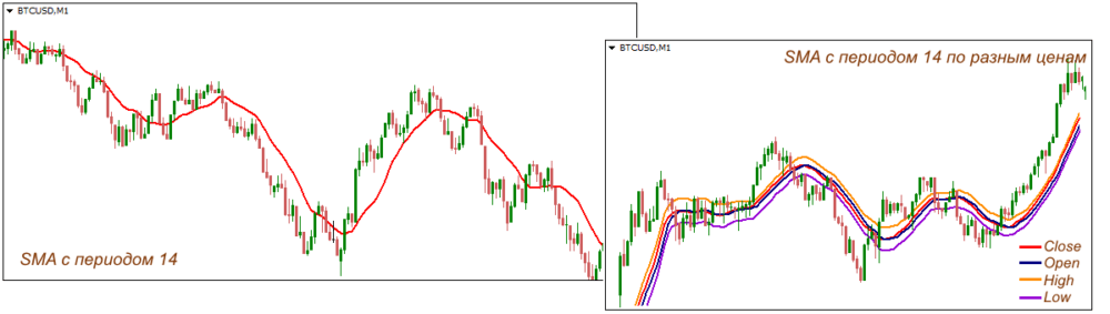 Задача Moving Average убрать (сгладить) как можно больше рыночного шума, который мешает увидеть действительное направление тренда, особенно когда волатильность велика. Текущее значение рассчитывается как сумма цен за прошлые (по умолчанию 14) периоды, которая затем делится на их количество. Получаем «простую» (SMA) скользящую, представляющую собой среднее арифметическое прошлых ценовых изменений минус «шум». На рисунке расчет варианты расчетных цен, большого различия мы не видим: