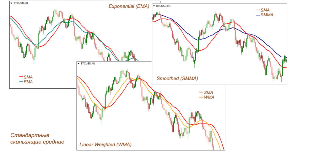 - сглаженная (Smoothed, SMMA). Обратный алгоритм: первые цены самые важные, с последующим уменьшением. Получаем большую устойчивость к «шуму» по сравнению с предыдущими. Несмотря на это используется редко, только на долгосрочных сделках.