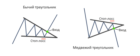 - Графические. Чаще всего в качестве основного ценового графика используются японские свечи, на основании которых трейдер принимает определенные решения по заключению сделок. Двойная вершина, треугольник (ниже пример подобной фигуры показан графически), голова и плечи, чашка с ручкой (подробно описана в материале по ссылке) – вот лишь некоторые из наиболее надежных и часто используемых моделей.