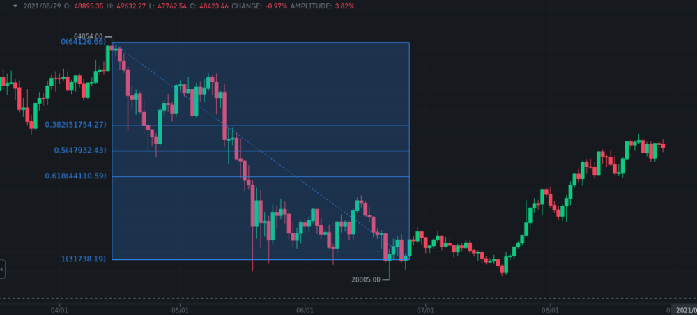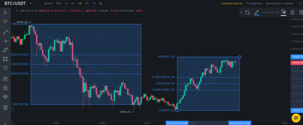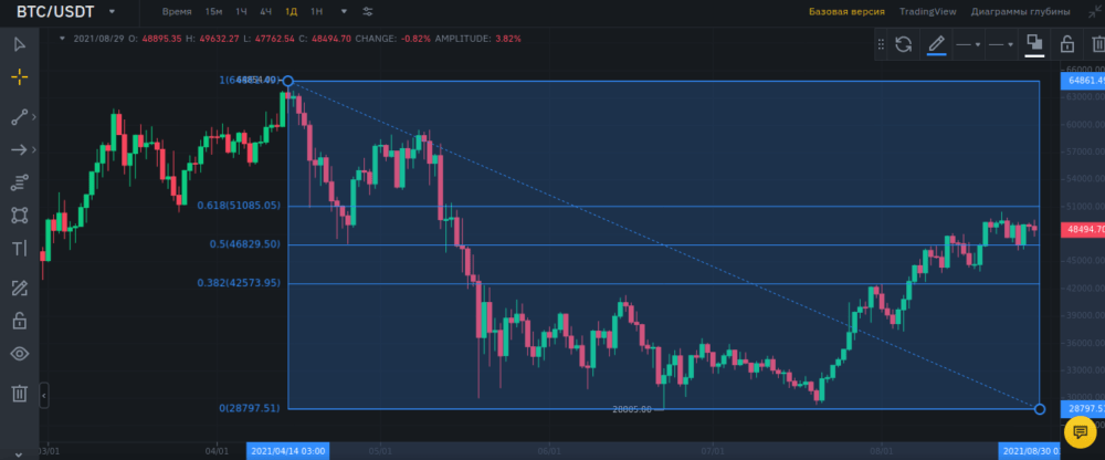 Наиболее универсальным и часто применяемым средством являются первые две разновидности. Ниже показан пример наложения на график Биткоина в трейдинг вью Binance, по умолчанию данное средство встроено в стандартный инструментарий, и трейдер избавляется от необходимости решения вопроса, где скачать его и как установить.