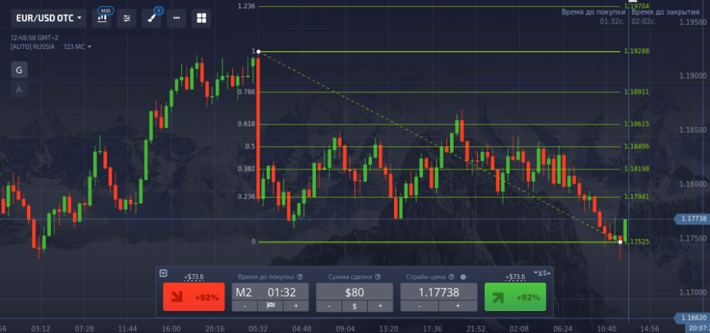 Нельзя не отметить удобство работы с этим инструментом в терминале от Pocket Option. Здесь построенные линии помимо основной формулы расчета величин отображают конкретные значения, в которых возможно наступление коррекций или разворота.