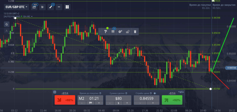 На графике евро-доллара у брокера Pocket Option откладываем уровни Фибоначчи. Исходя из текущей ситуации возможны 2 варианта протекания событий. При продолжении снижения к точке 0,83784 от существующей котировки имеем потенциальный профит 244 пункта, при этом стоп-лосс необходимо устанавливать в точке 50% — 0.85091, получаем риск в 64 пункта. Соотношение риск-профит — 1:4. Позиция рентабельна и при гипотетически выбранном развитии событий принесет отличный результат. Но в то же самое время имеем еще более внушительный потенциал роста — к 0.86398, что в пересчете на профит от текущих значений составляет уже 2062 пункта. Риск остается прежним. Соотношение 1:10. Однако для этого движения может потребоваться гораздо больше времени.
