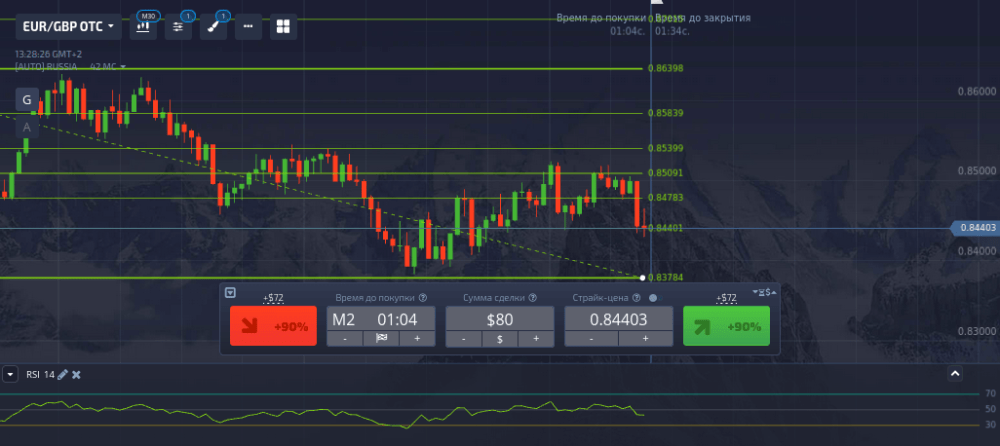 Да и не стоит забывать, что для получения прибыли по бинару достаточно правильно определить его направление. Для этого подключаем осциллятор RSI, и анализируя, что показывает он, вероятнее всего продолжение снижения, значит в этом направлении и нужно работать. Открываем сделку ниже с любым интервалом от 3 минут (позволит избежать краткосрочных флуктуаций).