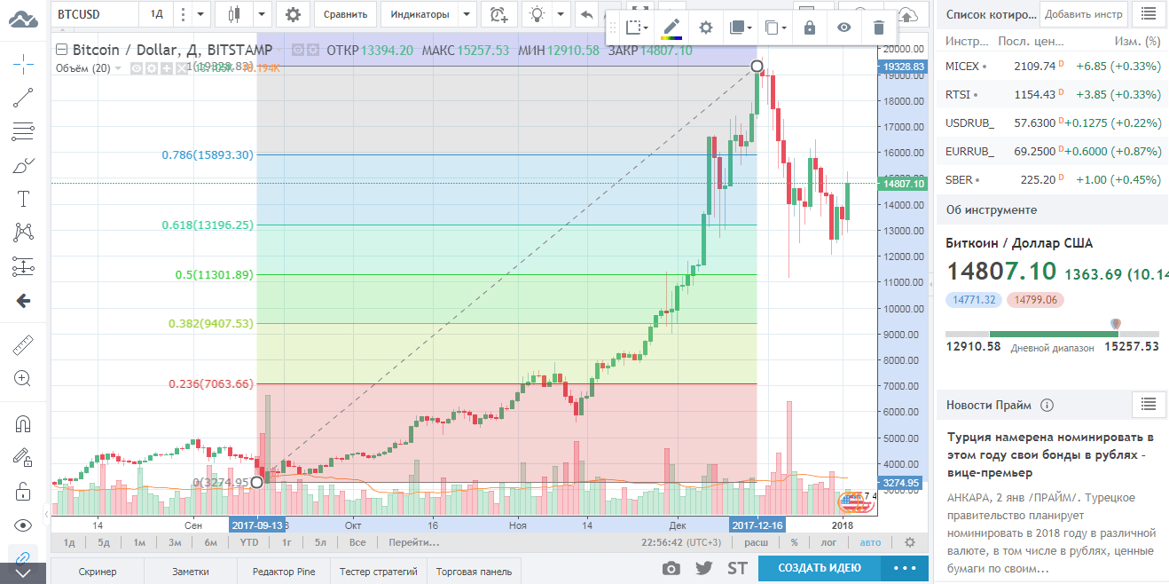После этого, на графике автоматически появятся плоские линии, которые соответствуют основным уровням Фибоначчи — 23.5%, 38.3%, 61.7% и 100%. Такие индикаторы используются для выявления вероятных моментов изменения стоимости (уровни коррекции) или продолжения тенденции рынка.